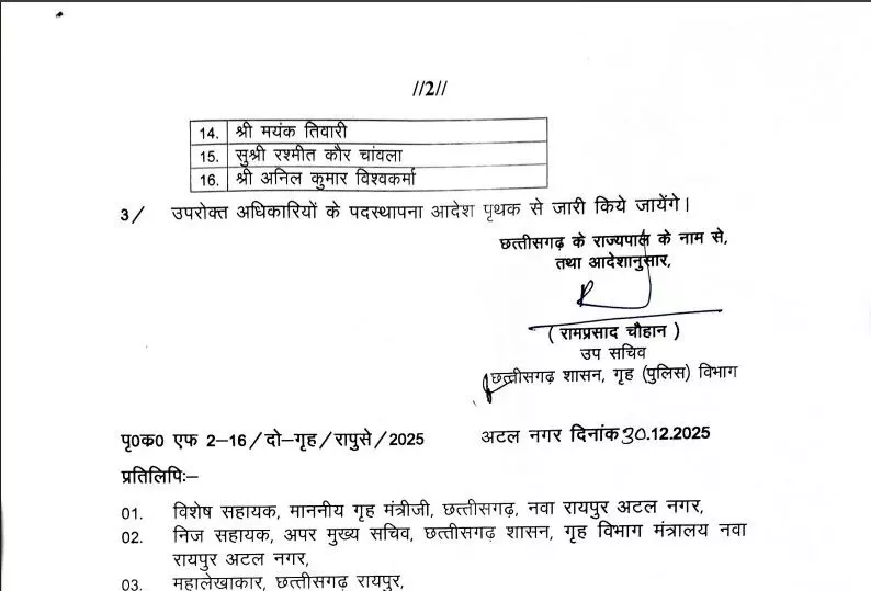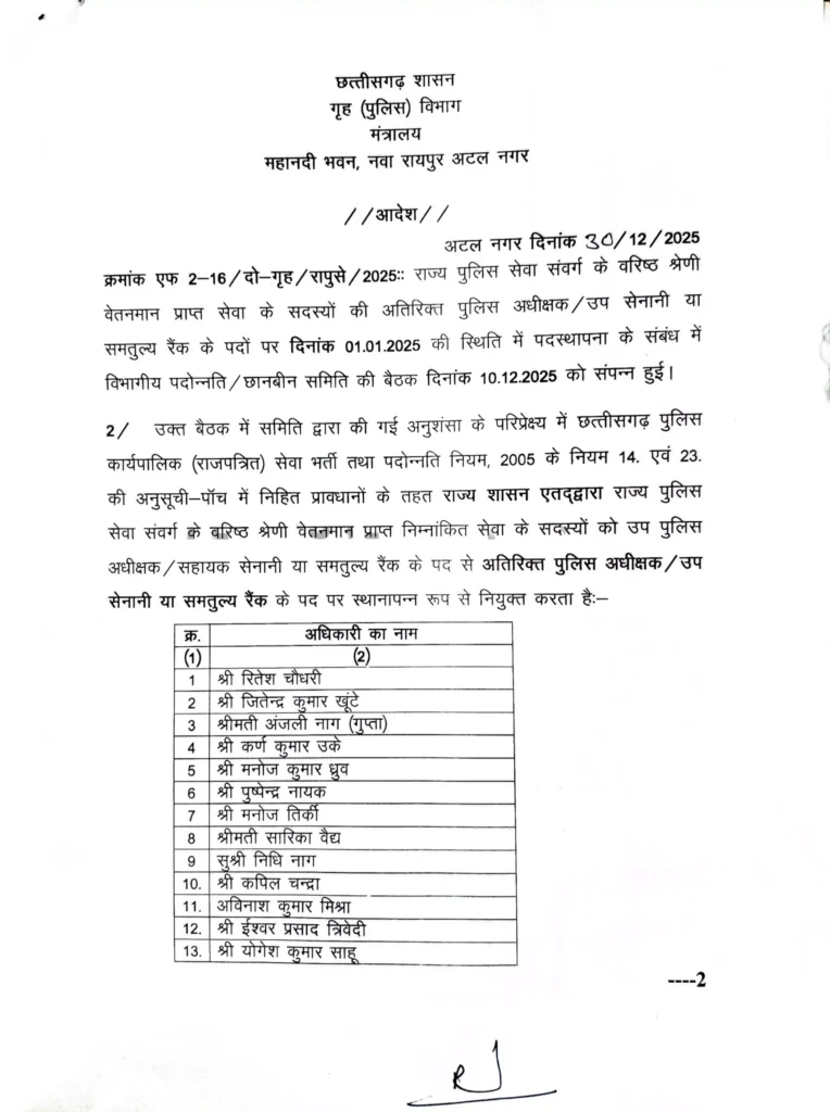 • छत्तीसगढ़ पुलिस में बड़ा प्रशासनिक फैसला: 16 DSP को ASP पद पर पदोन्नति, आदेश 1 जनवरी 2026 से प्रभावी