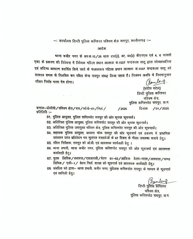 पुलिस आयुक्तालय द्वारा जारी आदेश की प्रतिलिपि पुलिस अधीक्षक, अतिरिक्त पुलिस आयुक्त, संबंधित थाना प्रभारी तथा अन्य वरिष्ठ अधिकारियों को आवश्यक अनुपालन हेतु भेजी गई है। रायपुर पुलिस ने आम नागरिकों से अपील की है कि किसी भी प्रकार की आपराधिक गतिविधि या कानून व्यवस्था से जुड़ी सूचना तत्काल पुलिस को दें, ताकि समय रहते प्रभावी कार्रवाई की जा सके।